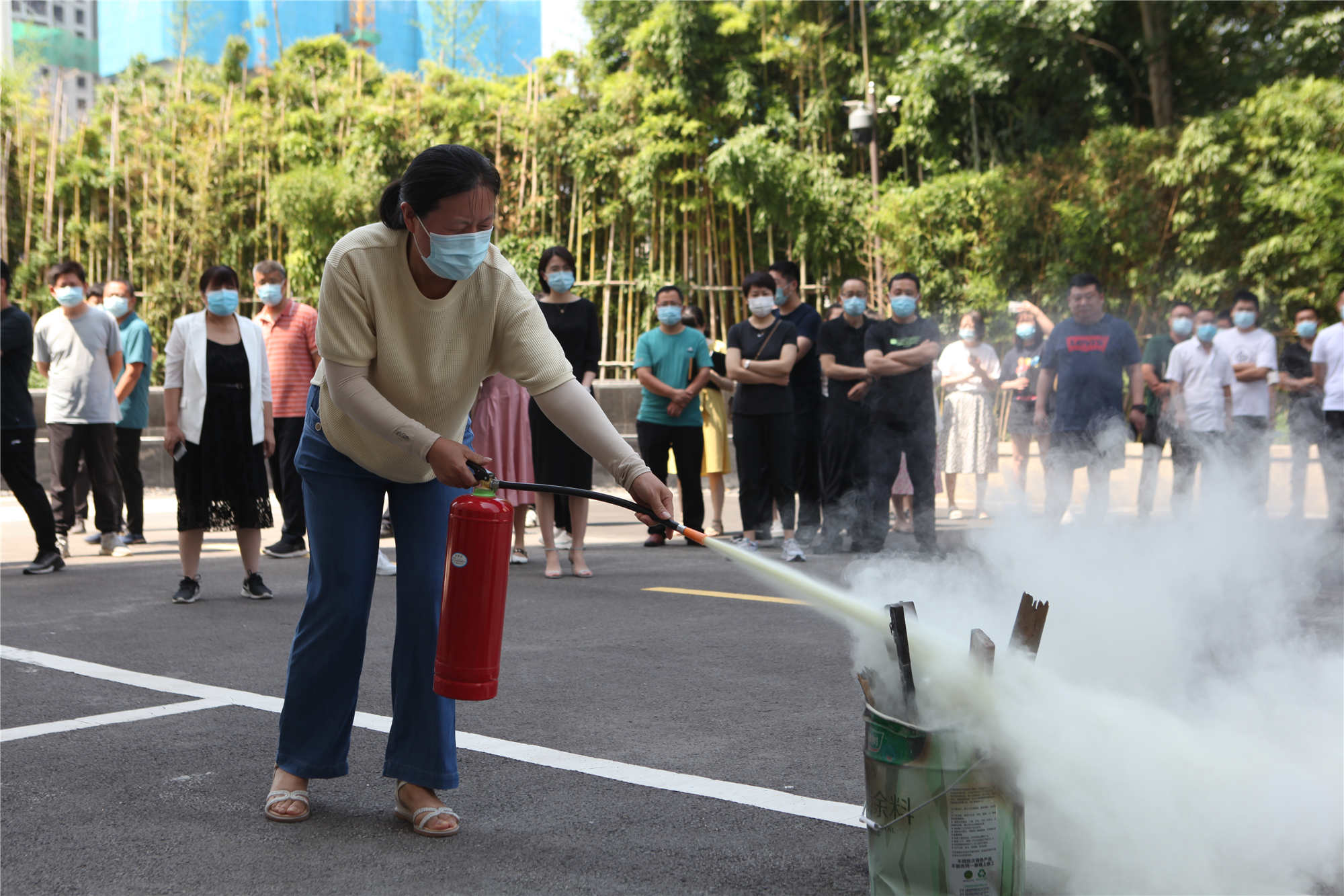 公司員工現(xiàn)場演練使用干粉滅火器滅火